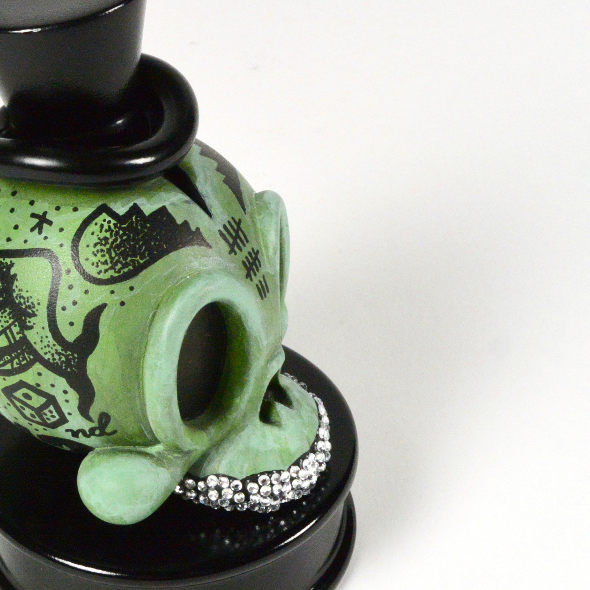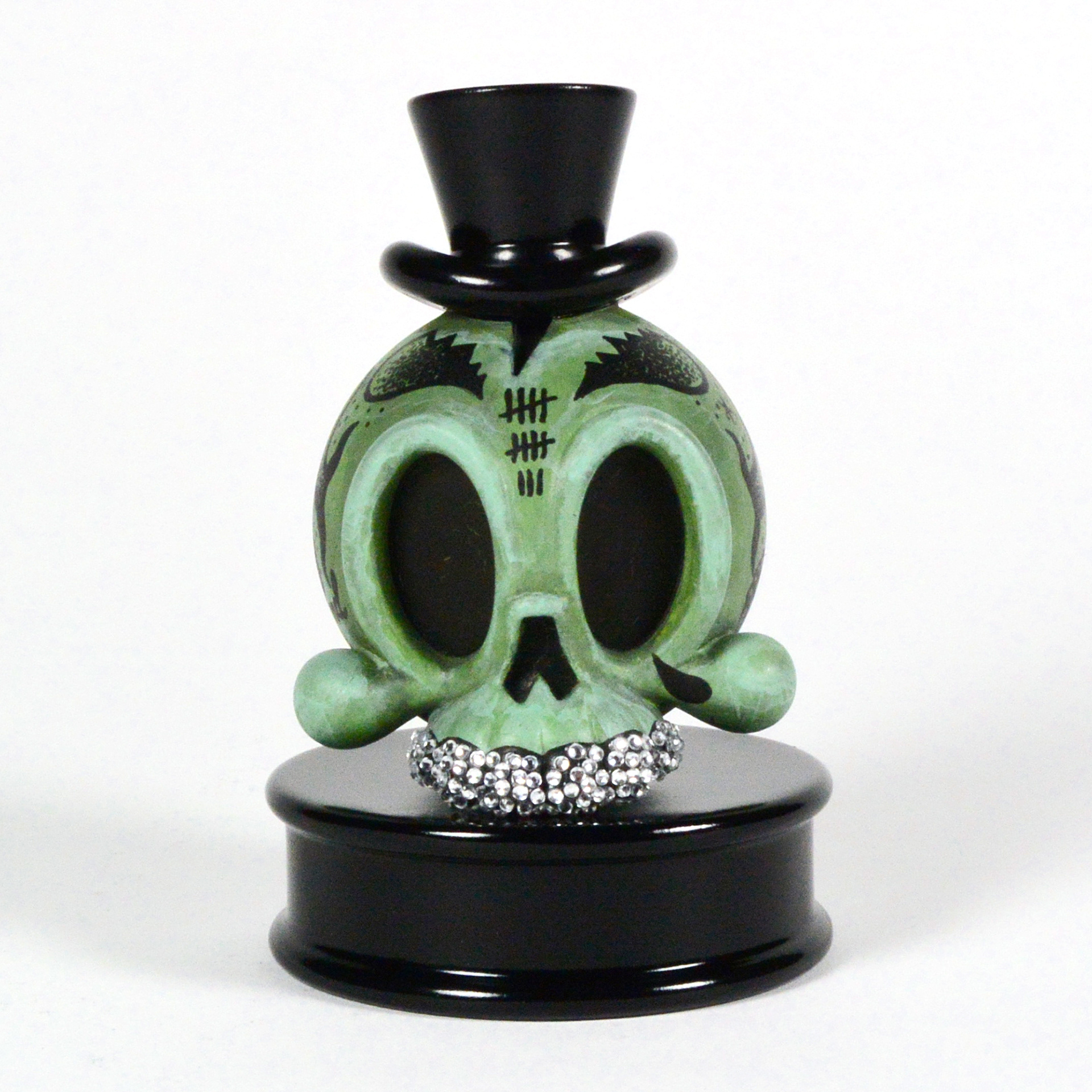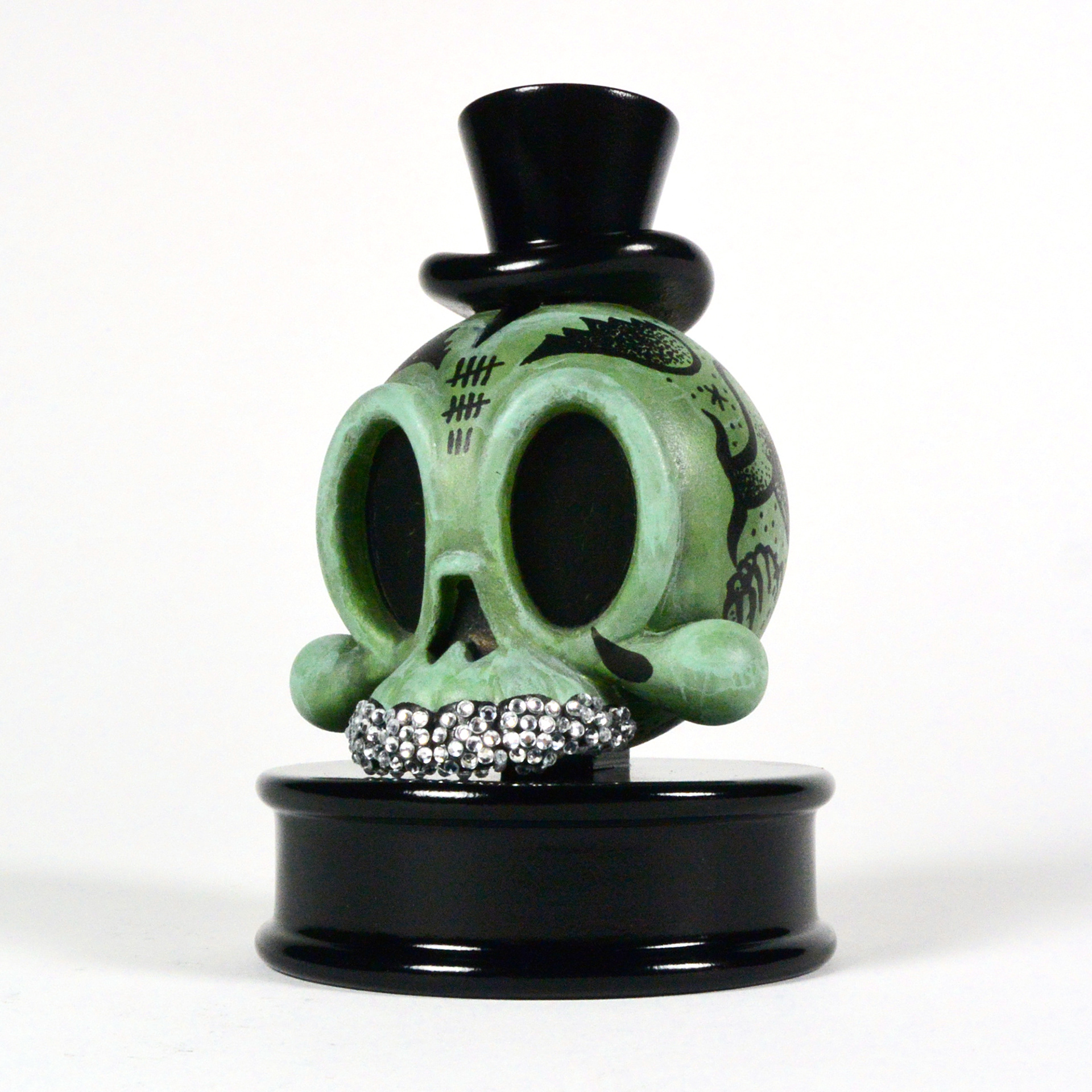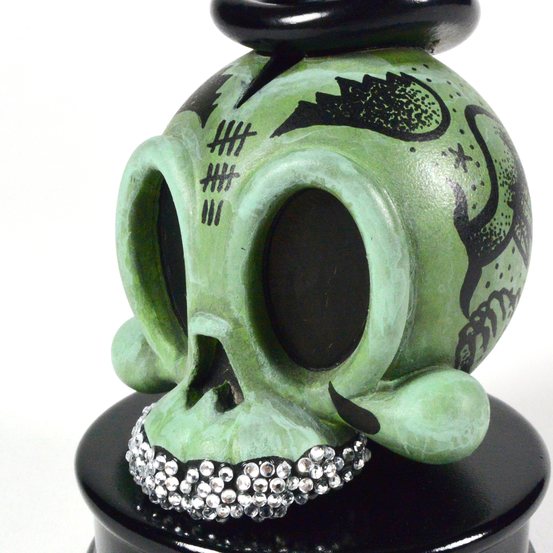 This custom 4.5in resin Modern Hero Skull comes "blinged" out with a smile you can't resist. It features hand painted weathering with inked on tattoo details and a whole bunch of hand placed diamonds. (fake of course)
