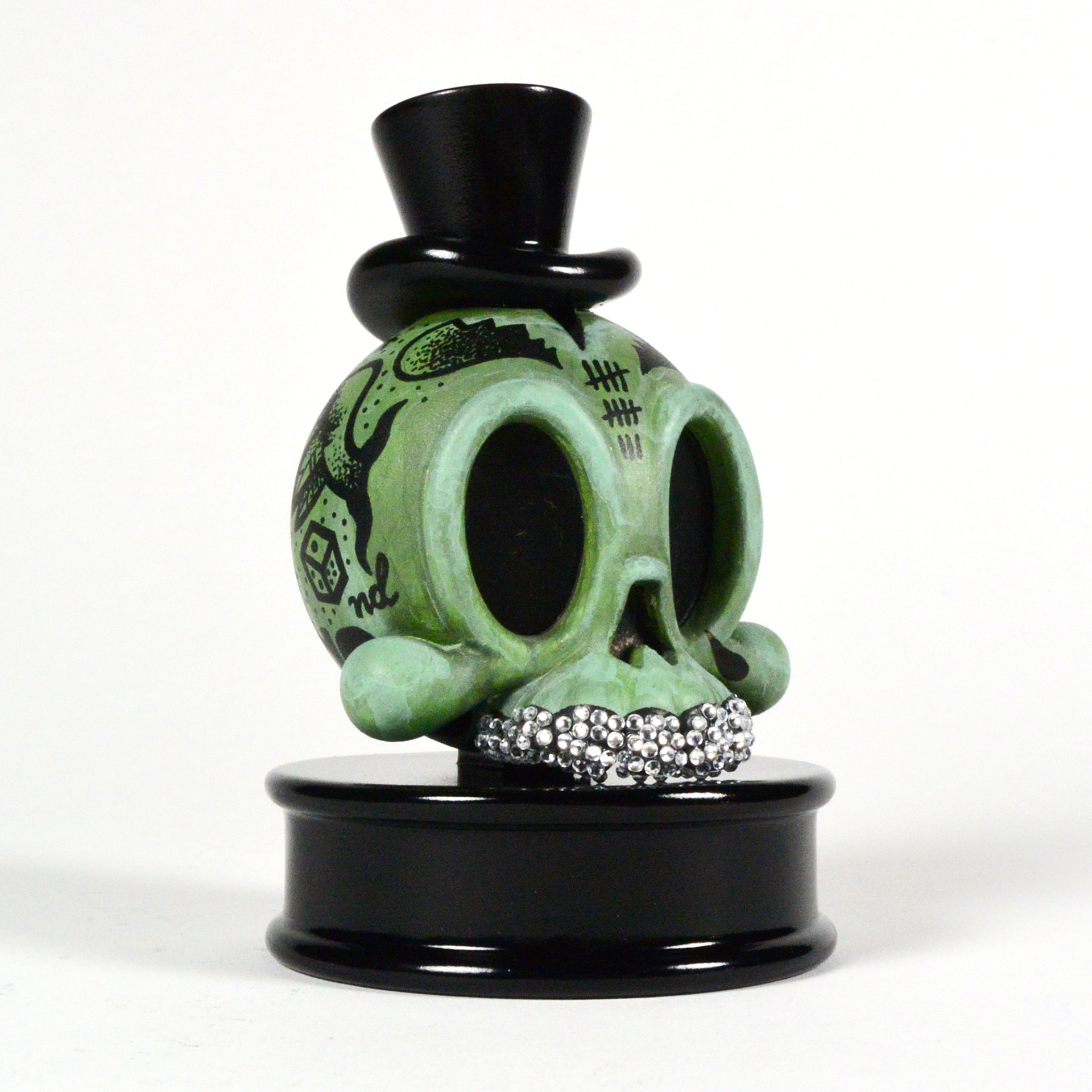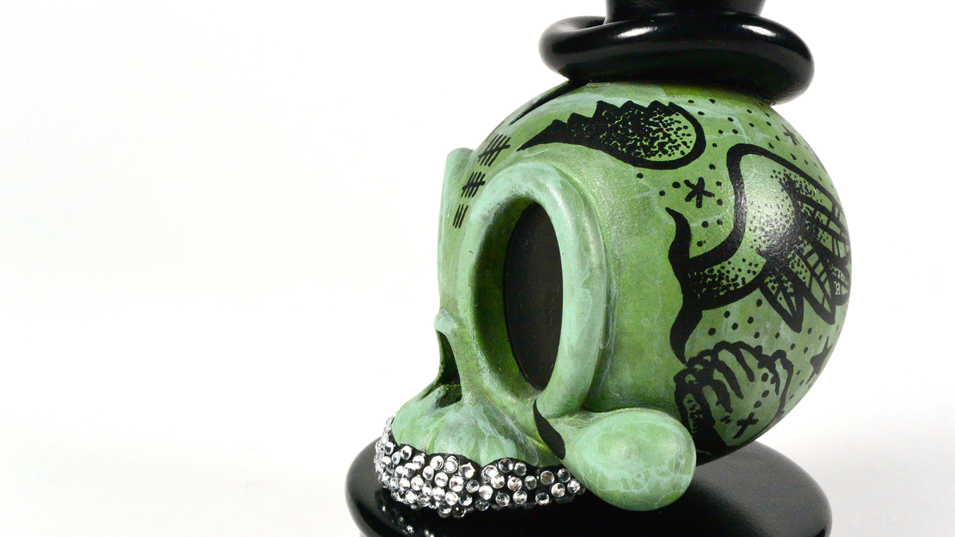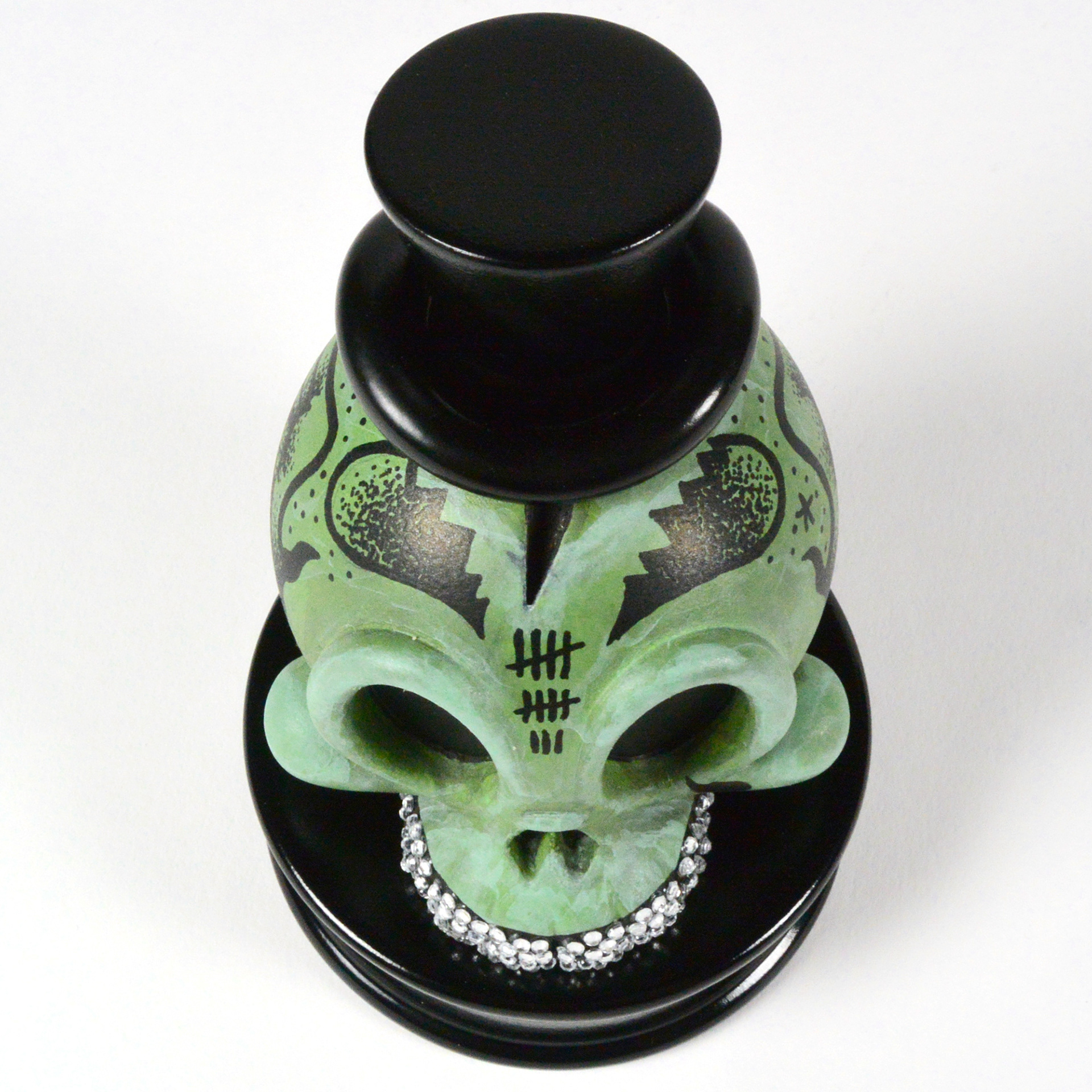 This custom 4.5in resin Modern Hero Skull comes "blinged" out with a smile you can't resist. It features hand painted weathering with inked on tattoo details and a whole bunch of hand placed diamonds. (fake of course)
